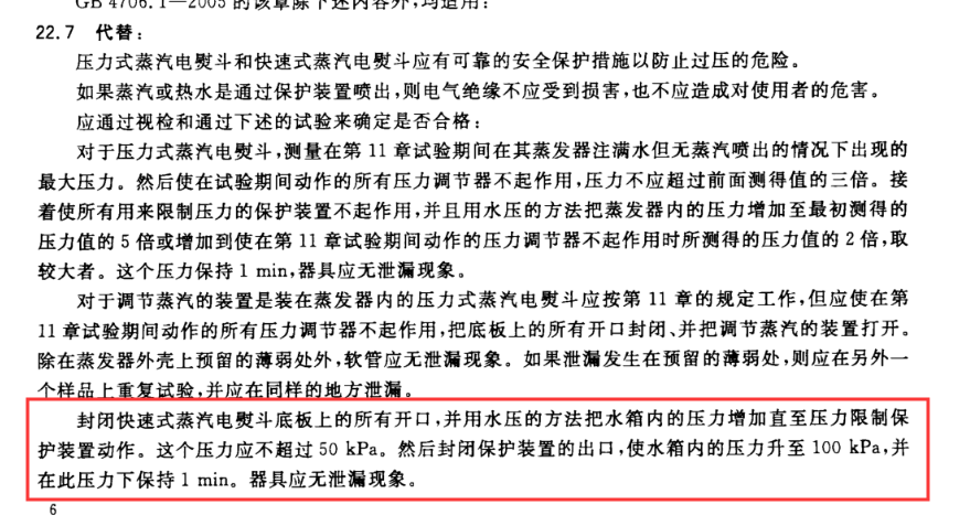 (2)對(duì)于調(diào)節(jié)蒸汽的裝置是裝在蒸發(fā)器內(nèi)的壓力式蒸汽電熨斗應(yīng)按第n 章的規(guī)定工作,但應(yīng)使在第11章試驗(yàn)期間動(dòng)作的所有壓力調(diào)節(jié)器不起作用,把底板上的所有開(kāi)口封閉、并把調(diào)節(jié)蒸汽的裝置打開(kāi)除在蒸發(fā)器外殼上預(yù)留的薄弱處外,軟管應(yīng)無(wú)泄漏現(xiàn)象如果泄漏發(fā)生在預(yù)留的薄弱處,則應(yīng)在另外一個(gè)樣品上重復(fù)試驗(yàn),并應(yīng)在同樣的地方泄漏。