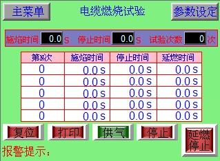 (2)施焰(燃燒)計(jì)時(shí):即正常工作的噴燈到達(dá)規(guī)定位置時(shí)對試樣進(jìn)行供火燃燒的時(shí)間,能自動記錄該時(shí)間;當(dāng)將要達(dá)到預(yù)置時(shí)間時(shí)倒數(shù)3S,控制系統(tǒng)發(fā)出提示音提醒操作員準(zhǔn)備快速將噴燈撤離,最后1s發(fā)出提示音后立即停止對試樣供火;