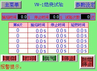 5.如需做VW-1試驗(yàn),在開始選擇好此模式后,調(diào)整好各儀表數(shù)值后點(diǎn)燃噴燈后,此時(shí)把噴燈壓下(即傾斜20度角),噴燈下方的微動開關(guān)閉合,表示對試樣施加火焰;面板上的施焰時(shí)間繼電器開始計(jì)時(shí),到達(dá)13秒(時(shí)間視具體試驗(yàn)?zāi)J蕉ǎ?,儀器發(fā)出提示音(每秒一次)共三聲,表示施焰時(shí)間(15S)已到,提示用戶停止施焰;抬起噴燈后,噴燈下方的微動開關(guān)斷開,儀器停止施焰計(jì)時(shí),并自動啟動停止與延燃計(jì)時(shí);當(dāng)施驗(yàn)次數(shù)(如5次)到達(dá)后,儀器自動關(guān)閉氣源;在延燃過程中,腳踩腳踏開關(guān)則停止延燃計(jì)時(shí);如果一直沒有踩腳踏開關(guān),而延燃時(shí)間又到達(dá)延燃時(shí)間繼電器之設(shè)定值后,儀器發(fā)出報(bào)警音,表示延燃超時(shí),試驗(yàn)失敗,報(bào)警音持續(xù)5秒后系統(tǒng)自動停止報(bào)警音;其它試驗(yàn)?zāi)J较虏僮鞣椒愅疲辉儋樖觥?/span>