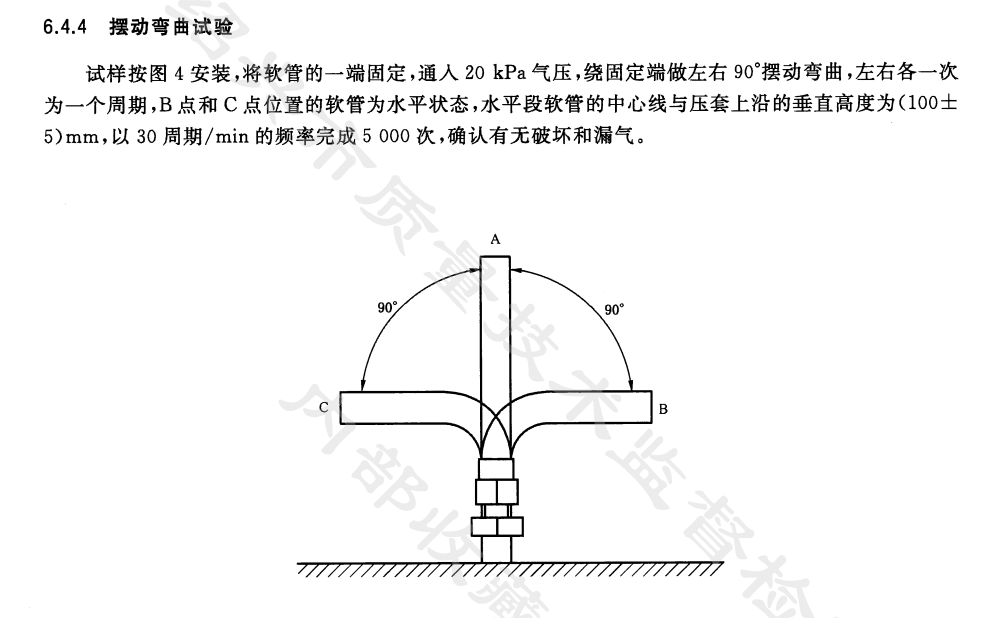 • 燃氣灶具連接軟管擺動彎曲試驗機適用于燃氣用具產(chǎn)品連接用金屬包裹軟管的耐彎曲和扭曲試驗,按標準要求所示取1000mm的試樣軟管,在通入20Kpa的空氣壓力狀態(tài)下,一端固定于實驗臺上,在100mm±5mm處呈90°彎曲,另一端與固定手柄連接且密封,用手柄使軟管繞軸線旋轉(zhuǎn),A-B-A,A-C-A二次為一個周期,扭動周期為30周期/min,扭轉(zhuǎn)周期為5000個周期,觀察波紋管有無裂痕和漏氣,防護套有無裂痕。