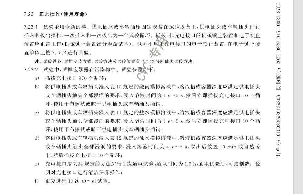 1. GB/T20234.1-2023《電動(dòng)汽車傳導(dǎo)充電用連接裝置 第1部分:通用要求》標(biāo)準(zhǔn)中第7.23正常操作(使用壽命)條款要求;