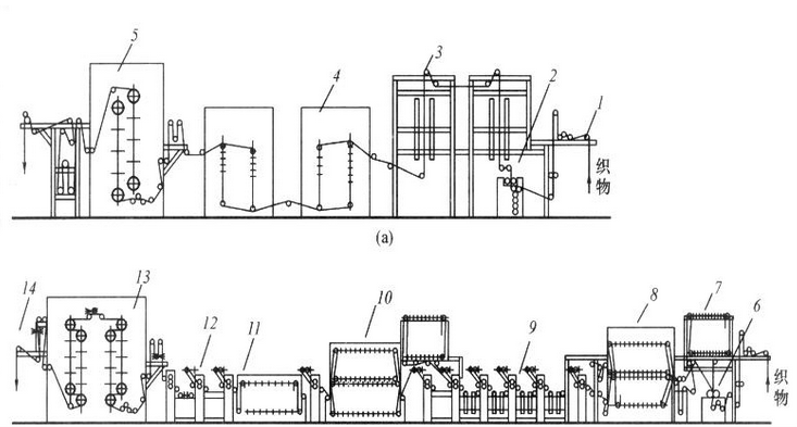 組成 | 除染機(jī)外,須配備脫水機(jī)、開幅機(jī)和烘燥機(jī)等 | 主要由軋車、烘干、汽蒸或焙烘、平洗等單元組成 |