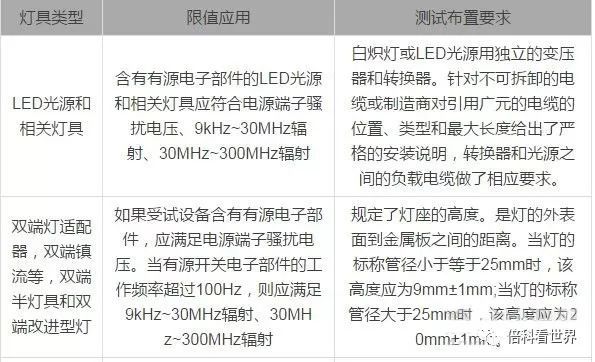 1. 對于本標準范圍以外并且照明作為次要功能的設備(如照明作為次要功能的吸油煙機、電風扇、冰箱、冷凍箱、烤箱和帶氛圍照明的電視),只需要在按照其適應標準進行評估時運行了照明功能,則無需單獨按照本標準評估期照明功能;明確了輻射騷擾測試項目的適用范圍。例如:熒光燈和其它放電燈用獨立的鎮(zhèn)流器、半燈具、自鎮(zhèn)流燈、紫外線和(或)紅外線器具、對冷陰極管形放電燈、自容式應急燈等。應符合電源端子騷擾電壓、30MHz~300MHz輻射。燈電流工作頻率超過100Hz時,還應符合9kHz~30MHz輻射;