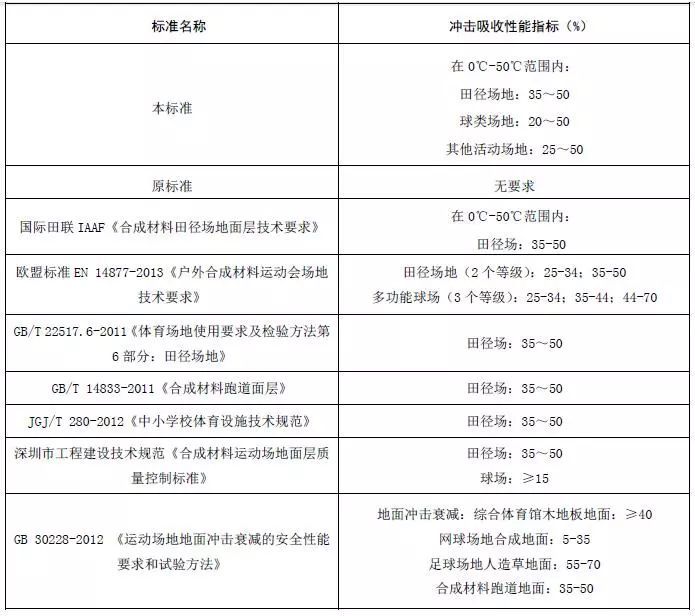原標準中規(guī)定的邵氏硬度、壓縮復(fù)原率、回彈值,鑒于目前國際、國內(nèi)相關(guān)標準已不再將其作為運動面層物理性能指標,因此在本標準中予以刪除。
