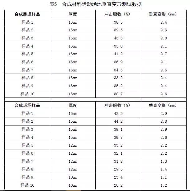 場地面層的垂直變形也不能太小,場地面層垂直變形越小,場地表面就越硬,不利于對運動員的安全保護。歐盟標準EN 14877-2013《戶外合成材料運動場地技術(shù)要求》規(guī)定了田徑場地面層垂直變形值上限為3mm,國家標準GB/T 14833-2011和 GB/T 22517.6-2011規(guī)定了田徑場地面層垂直變形下限為0.6 mm,因此參照以上歐盟標準和國家標準要求,并且結(jié)合實際檢測結(jié)果(見表5),將本標準的垂直變形規(guī)定為0.6 mm~3 mm。