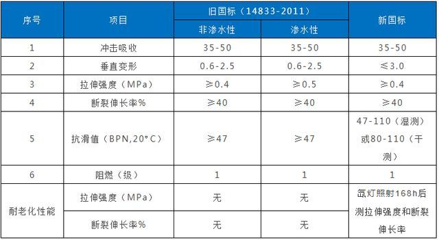 新國(guó)標(biāo)相對(duì)于GB/T19851.11-2005增加了合成材料運(yùn)動(dòng)場(chǎng)地面層、現(xiàn)澆型面層、預(yù)制型面層、人造草、沖擊吸收、垂直變形、抗滑值、拉伸強(qiáng)度、拉斷伸長(zhǎng)率、耐老化性能、阻燃性能、坡度、厚度等項(xiàng)目和指標(biāo)要求。這里只做了新國(guó)標(biāo)和GB/T14833-2011的對(duì)比: