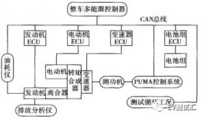 臺(tái)架測(cè)試是把發(fā)動(dòng)機(jī)、電動(dòng)機(jī)/發(fā)電機(jī)、蓄電池及變速器等總成部件按照混合動(dòng)力總成布置方案安裝在發(fā)動(dòng)機(jī)臺(tái)架上,利用CAN總線把臺(tái)架測(cè)試控制系統(tǒng)與整車(chē)多能源控制器和各總成部件ECU連接起來(lái),實(shí)時(shí)測(cè)量混合動(dòng)力總成的各項(xiàng)參數(shù),控制動(dòng)力總成的運(yùn)行狀態(tài),并借助相關(guān)測(cè)試設(shè)備(如油耗儀、排放分析儀及電功率計(jì)等)完成動(dòng)力性、燃油經(jīng)濟(jì)性、排放及噪聲等整車(chē)性能測(cè)試試驗(yàn)。并聯(lián)式動(dòng)力總成臺(tái)架能耗排放試驗(yàn)示意圖,例圖所示。