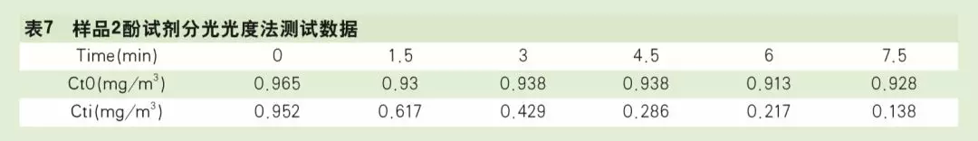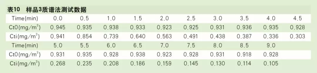 在30立方米測試艙同時使用酚試劑分光光度法和質(zhì)譜法測試享優(yōu)樂牌空氣凈化器(KJ550F-QJ0401A)的甲醛CADR,3組濾網(wǎng)按照樣品1、樣品2、樣品3編號,測試艙內(nèi)甲醛初始濃度和溫濕度基本一致,以x軸為時間,y軸為濃度制作曲線,甲醛自然衰減和總衰減的試驗曲線如圖3~圖5所示。樣品1酚試劑分光光度法、質(zhì)譜法測試數(shù)據(jù)分別見表5、 表6,樣品2酚試劑分光光度法、質(zhì)譜法測試數(shù)據(jù)分別見表7、表8。樣品3酚試劑分光光度法、質(zhì)譜法測試數(shù)據(jù)分別見表9、表10。