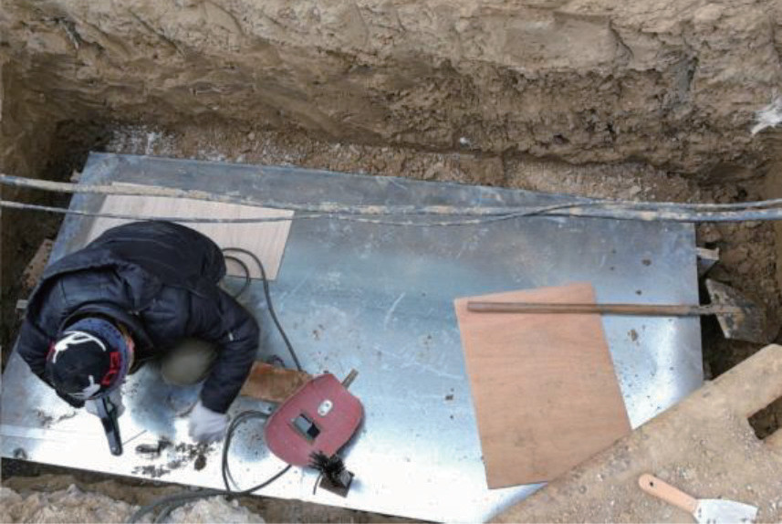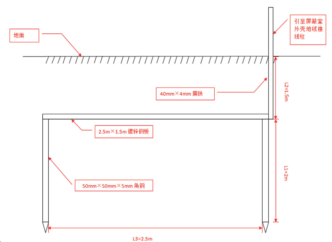 屏蔽室的接地對其建設來說是至關重要的環(huán)節(jié),接地性能的好壞直接影響到檢測數(shù)據(jù)的準確性,為了使屏蔽室達到最好效果的接地,最終確定的方案是屏蔽室單獨接地排,與暗室接地實現(xiàn)物理界分離,避免高頻信號的互耦而增加不確定度。但由于實驗室場地有限,不符合設備商推薦的常規(guī)地基鋪設方法:要求至少四個地極,且地極之間的距離達到3 m。在如此有限的空間內(nèi)如果鋪設的話很難達到標準和工藝要求:地極與周圍土壤的阻抗< 1 Ω 的。面對難題,我們大量查閱相關資料、討論施工方案,最終創(chuàng)新性地采用了垂直接地極與水平接地板相結(jié)合的接地方式,將垂直地極盡可能深的打入地面,同時在地極最上端焊接2.5 m×1 m 的水平鍍鋅板以增加與土壤間的接觸面積,在水平鍍鋅板上面鋪灑鹽粒及增加土壤濕度以更好的降低電阻率,最終達到了標準要求,地極與周圍土壤的電阻率只有0.17 Ω。