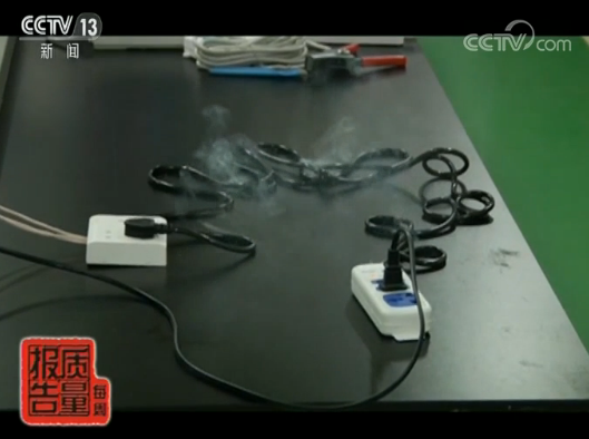 這是溫升試驗(yàn)的檢測(cè)現(xiàn)場(chǎng),溫升是檢測(cè)插座配線能否讓消費(fèi)者安全使用的一項(xiàng)試驗(yàn)。當(dāng)工程師模擬消費(fèi)者日常使用場(chǎng)景,并按下插座電源的開(kāi)關(guān)時(shí),試驗(yàn)開(kāi)始。記者看到這條延長(zhǎng)線插座的配線,在試驗(yàn)開(kāi)始30秒后出現(xiàn)軟化的現(xiàn)象,1分鐘后配線開(kāi)始冒煙,1分30秒后配線爆炸起火。