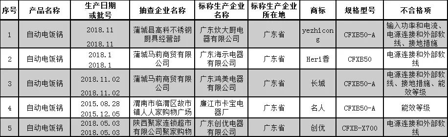 自動(dòng)電飯鍋不合格產(chǎn)品及其企業(yè)名單