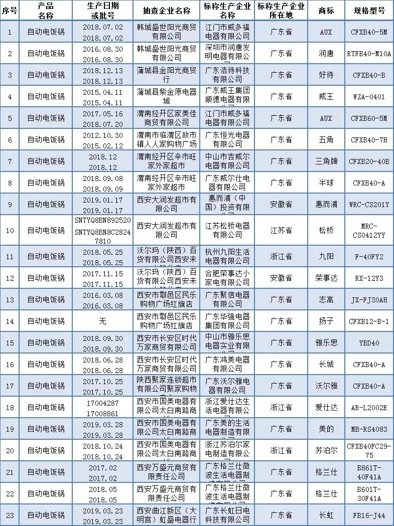 自動(dòng)電飯鍋合格產(chǎn)品及其企業(yè)名單