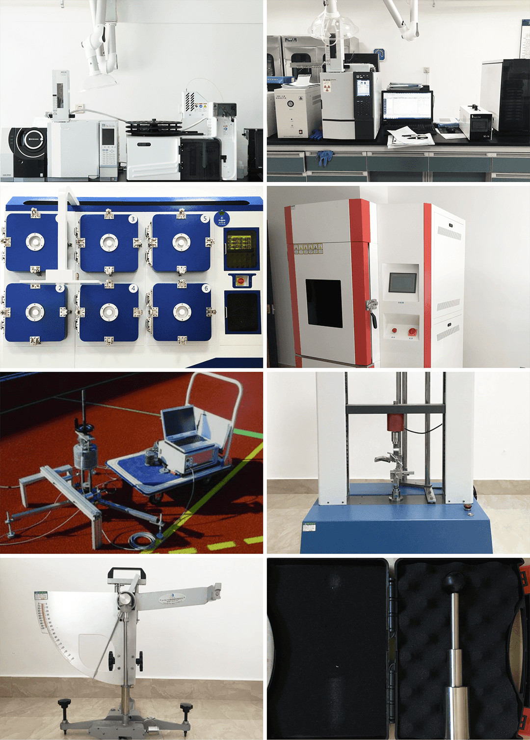 正信檢測(cè)以固定、可移動(dòng)兩種方式進(jìn)行檢測(cè),建立了專業(yè)運(yùn)動(dòng)場(chǎng)地合成材料面層及原材料實(shí)驗(yàn)室等。企業(yè)配備了先進(jìn)的儀器設(shè)備,包括進(jìn)口氣相色譜-質(zhì)譜聯(lián)用儀(GC-MS)、塑膠跑道面層耐老化試驗(yàn)箱、專業(yè)VOC環(huán)境測(cè)試艙、拉力試驗(yàn)機(jī)、沖擊吸收檢測(cè)儀/垂直變形測(cè)試儀、抗滑值測(cè)定儀、塑膠跑道三針測(cè)厚儀等。