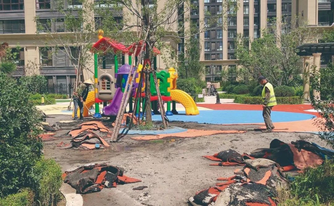 但在一處兒童游樂(lè)場(chǎng)地,記者見(jiàn)到有幾名工人正在撕扯著塑膠地面,進(jìn)行拆除。工人們說(shuō),自己受雇對(duì)該處塑膠地面進(jìn)行拆除,但指派方是物業(yè)還是開(kāi)發(fā)商并不清楚,“可能拆除游樂(lè)場(chǎng)地后,再拆跑道?!?/span>