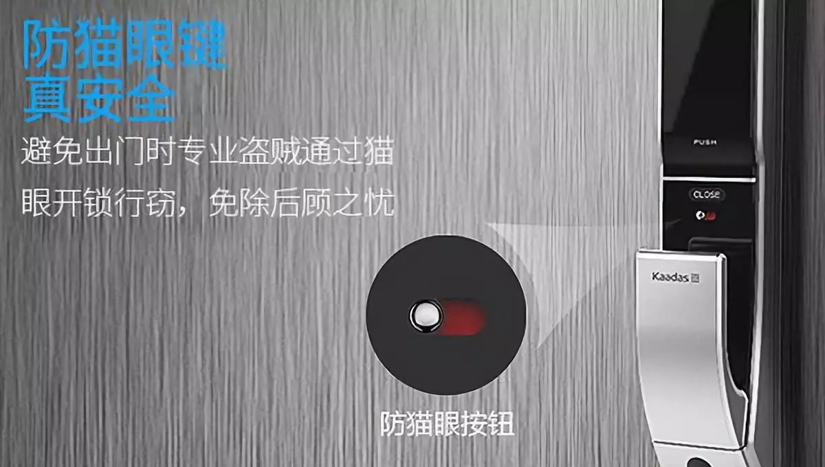 現(xiàn)在很多品牌的智能鎖生產(chǎn)商們針對這一現(xiàn)象特意設(shè)計了一個防貓眼開鎖按鈕,撥動按鈕之后可以直接將門把手固定,在門內(nèi)無法按壓把手,在門外還是能夠用正確的開鎖方式開鎖,并不影響使用。