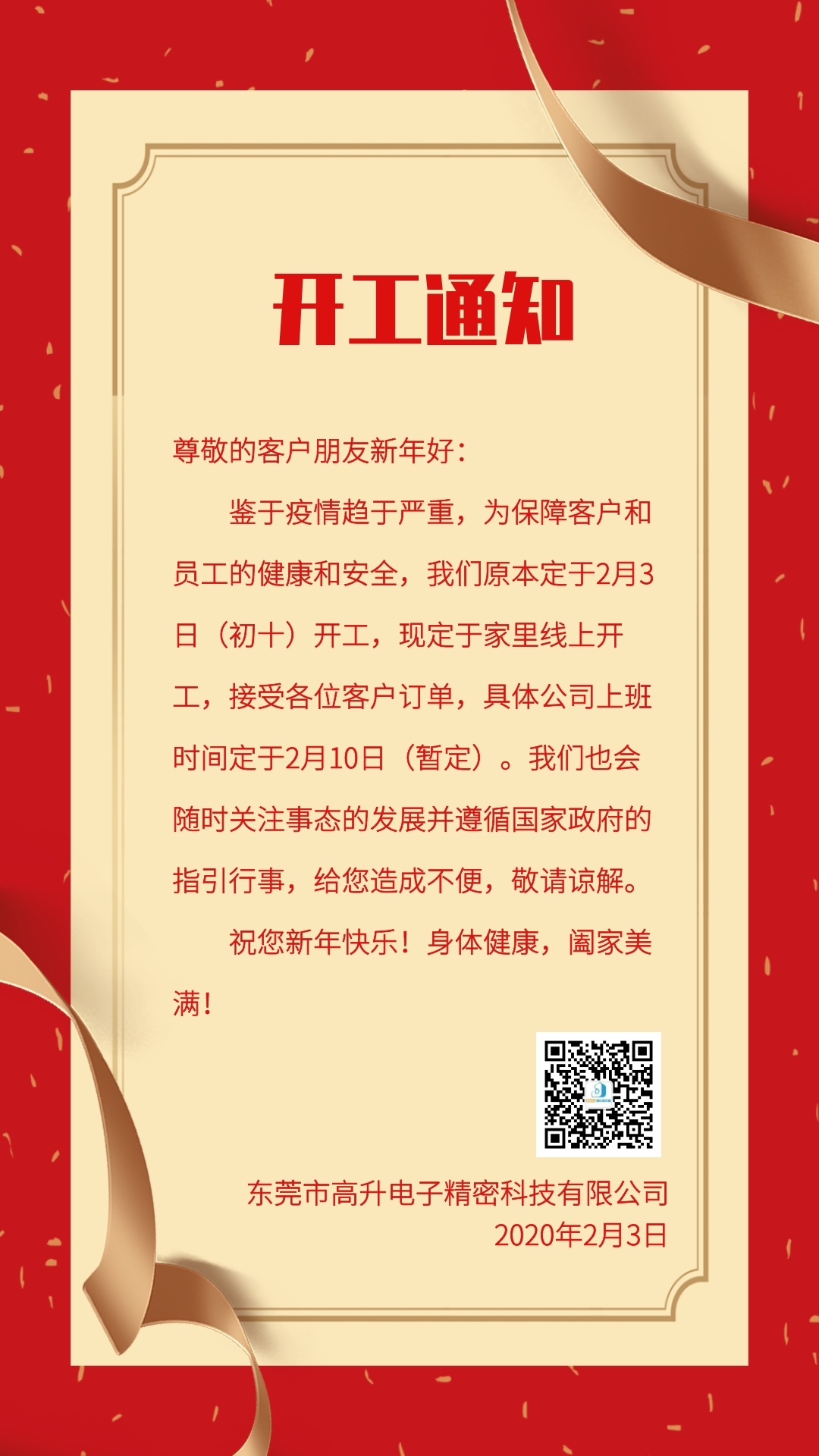 鑒于疫情趨于嚴(yán)重,為保障客戶和員工的健康和安全,我們?cè)径ㄓ?月3日(初十)開工,現(xiàn)定于家里線上開工,接受各位客戶訂單,具體公司上班時(shí)間定于2月10日(暫定)。我們也會(huì)隨時(shí)關(guān)注事態(tài)的發(fā)展并遵循國家政府的指引行事,給您造成不便,敬請(qǐng)諒解。