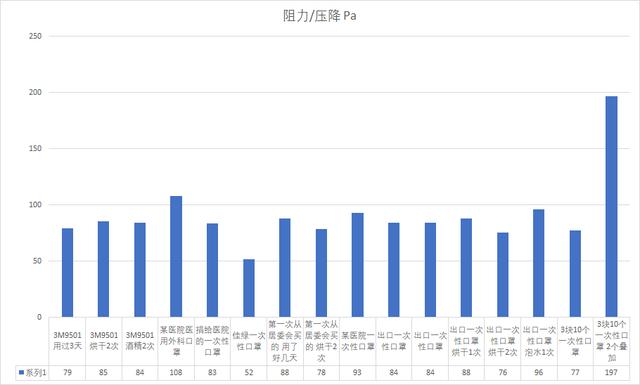 如上下降效率最大的貢獻(xiàn)是2次100度高溫烘烤,實(shí)際中間幾次80烘烤對(duì)效率的影響是很小的。第二次烘烤之后這些樣品統(tǒng)一都拿到TSI 8130上測(cè)過過濾效率,KN95 3M9501還有97%的過濾效率,所有樣品過濾阻力都沒有增加,畢竟我們現(xiàn)在主要是為了防病毒,外面停工停學(xué)了空氣質(zhì)量好得不得了,不會(huì)有顆粒物過多導(dǎo)致口罩堵塞阻力加大的情況發(fā)生。
