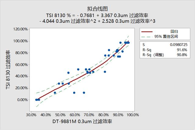 圖上數(shù)字是自測(cè)效率根據(jù)TSI8130的結(jié)果擬合曲線調(diào)整過,所以絕對(duì)值偏差在5%之內(nèi)都算正常。從圖上可以看出酒精對(duì)口罩的過濾效率影響還是很大的