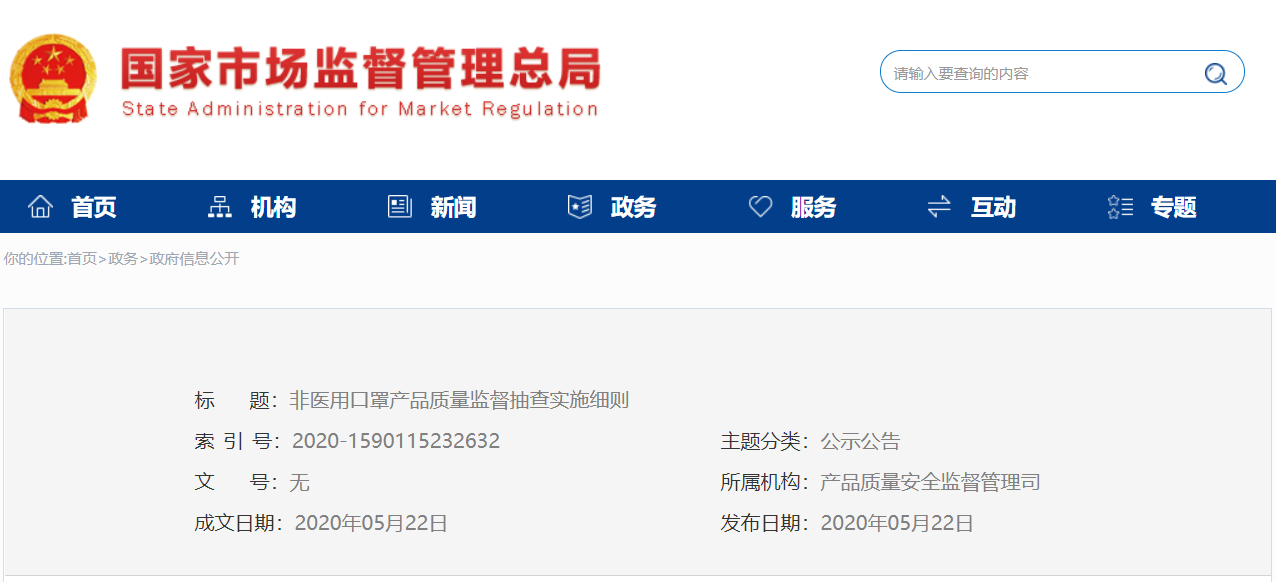 5月22日,國家市監(jiān)總局發(fā)布了關于“非醫(yī)用口罩產品質量監(jiān)督抽查實施細則”通告。