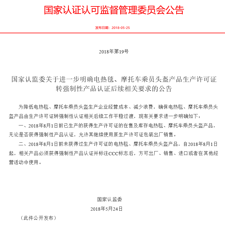 2018年8月1日前已生產(chǎn)的獲得生產(chǎn)許可證的在售及庫(kù)存電熱毯、摩托車乘員頭盔產(chǎn)品,無論是否獲得強(qiáng)制性產(chǎn)品認(rèn)證,允許其繼續(xù)使用原生產(chǎn)許可證包裝出廠銷售。