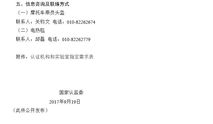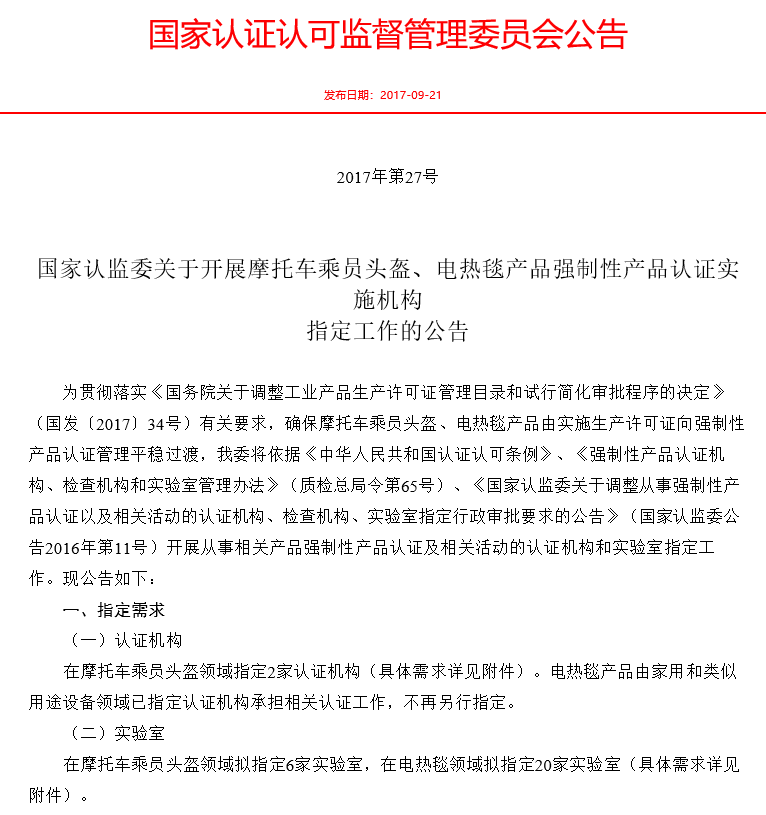 附2:國(guó)家認(rèn)監(jiān)委關(guān)于開展摩托車乘員頭盔、電熱毯產(chǎn)品強(qiáng)制性產(chǎn)品認(rèn)證實(shí)施機(jī)構(gòu)指定工作的公告