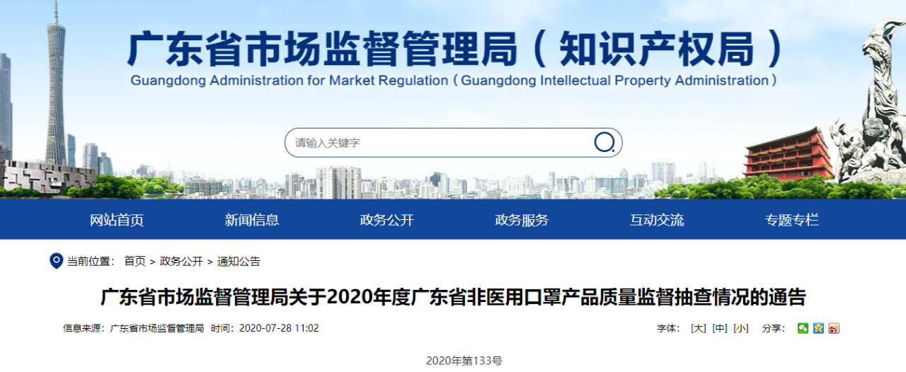 2020年度廣東省非醫(yī)用口罩產(chǎn)品質(zhì)量監(jiān)督抽查情況