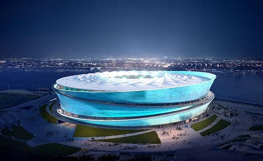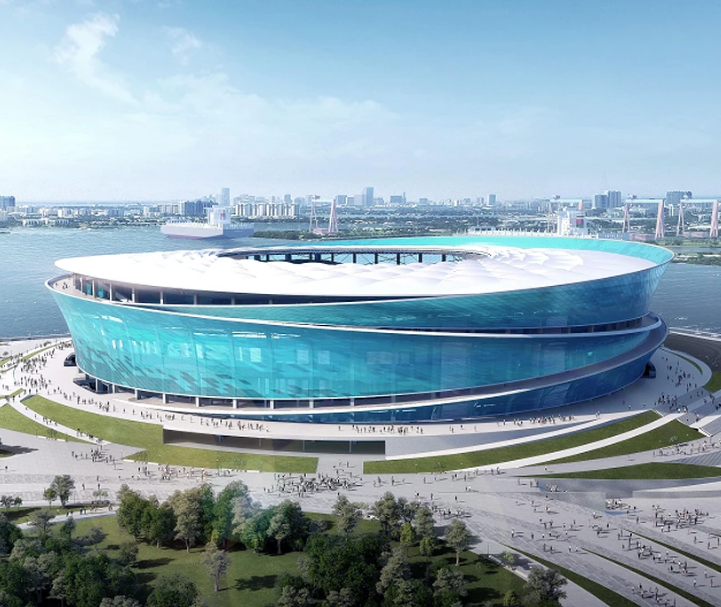 足球場設(shè)計理念為“炫彩疊浪”。建筑立面定妝色“海洋藍”,頂棚呈白色,“藍海白云”與飾面象征波光粼粼的水之形態(tài),將大連的海洋文化、足球精神融于一體。