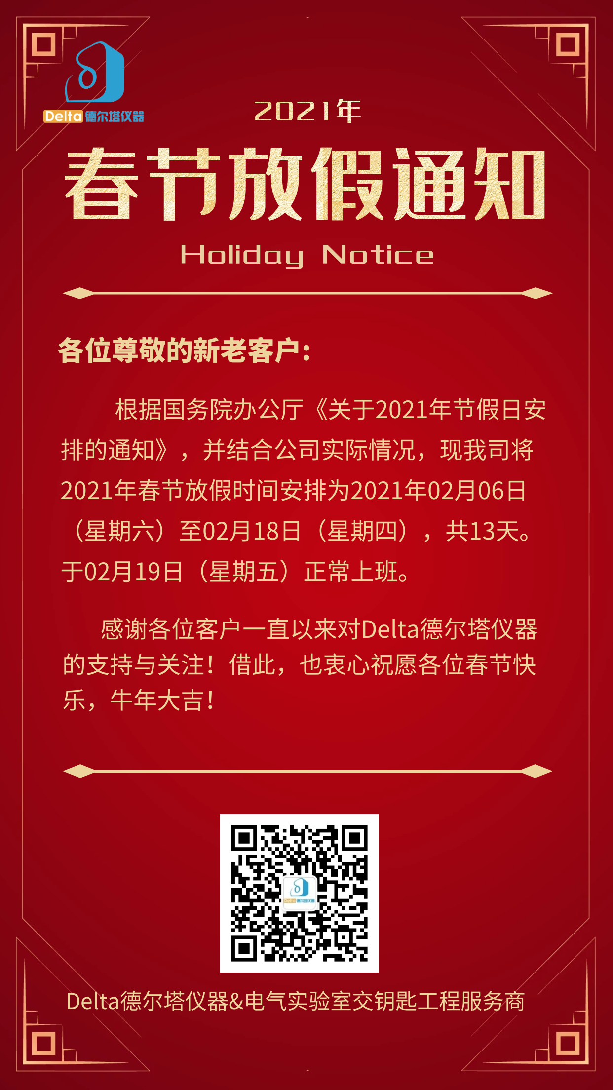 感謝各位客戶一直以來對Delta德爾塔儀器的支持與關(guān)注!借此,也衷心祝愿各位春節(jié)快樂,牛年大吉!