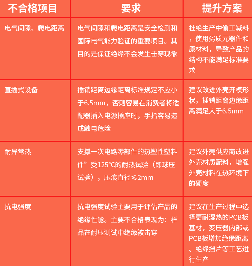 常見(jiàn)問(wèn)題及提升方案:電源適配器在經(jīng)歷潮態(tài)試驗(yàn)后,初次級(jí)之間PCB板上被高壓擊穿;建議在生產(chǎn)過(guò)程中選擇更耐濕熱的PCB板基材,變壓器內(nèi)部或PCB板增加絕緣距離、絕緣擋片等工藝進(jìn)行生產(chǎn)。