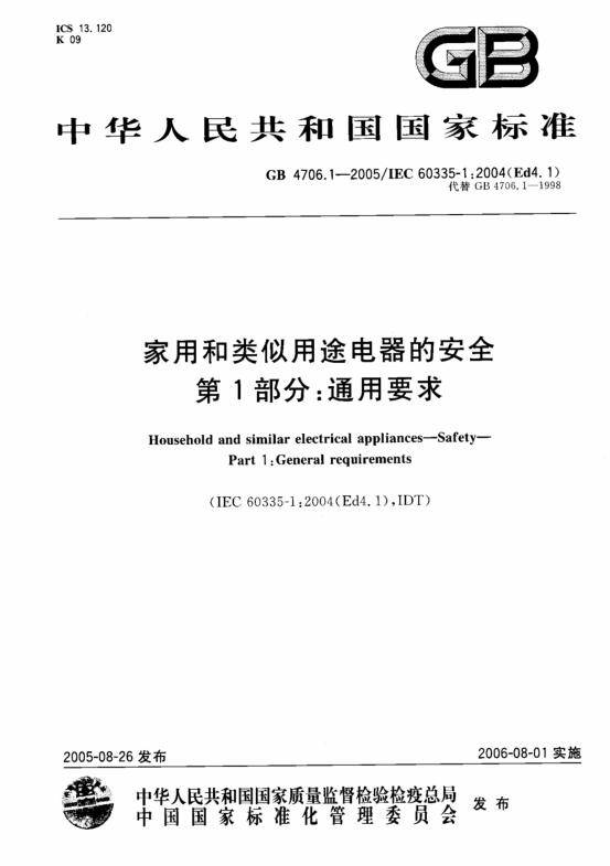 家用電器目前GB 4706.1-2005、GB 4706.19-2008標準已經(jīng)在實施當中。