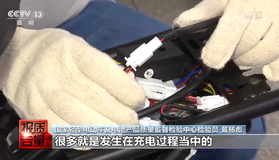 國家輕型電動車及電池產(chǎn)品質(zhì)量監(jiān)督檢驗中心檢驗員 戴楊彪:先看一下主電路,電池的輸出端是安裝了短路保護裝置的。充電線路從充電口找到充電口端到線路,這個車很顯然是沒有安裝的。這個充電線路的一個短路保護裝置對于我們充電過程能夠起到一個保護作用,現(xiàn)在很多自燃事件就是發(fā)生在充電過程當中的。