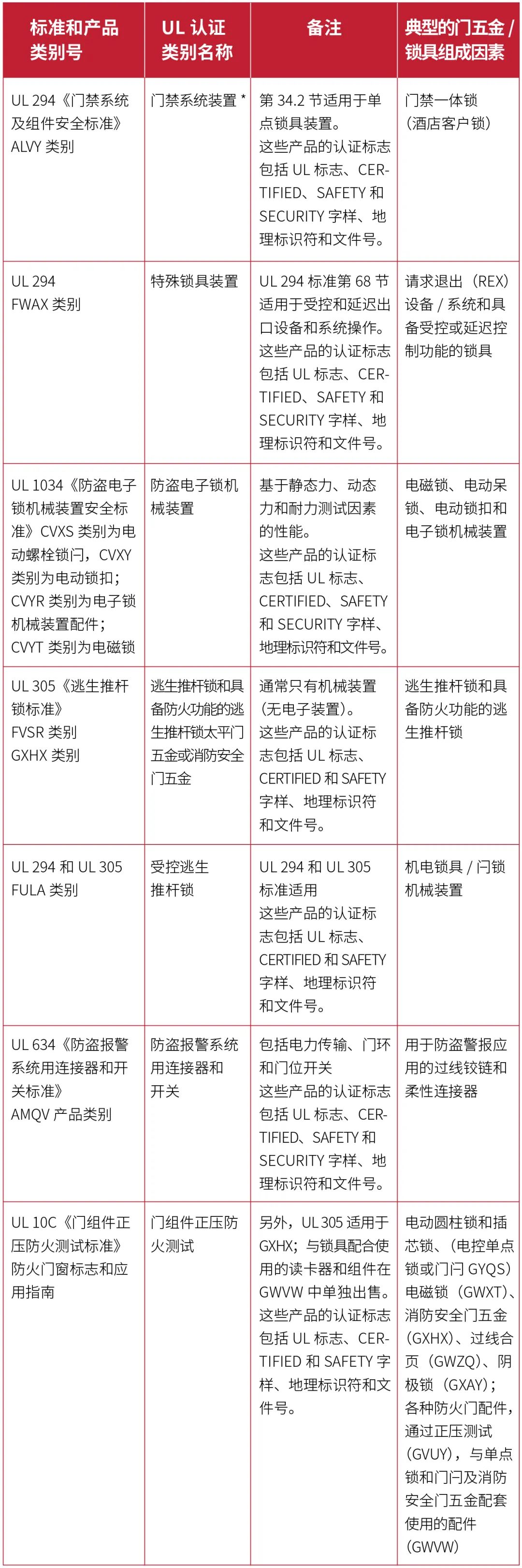 下表總結(jié)了UL對(duì)常用于出口通道或受控區(qū)域的各種鎖具和門禁系統(tǒng)的主要分類和標(biāo)準(zhǔn)。UL認(rèn)證標(biāo)志屬性在“備注”欄中進(jìn)行了標(biāo)識(shí)。