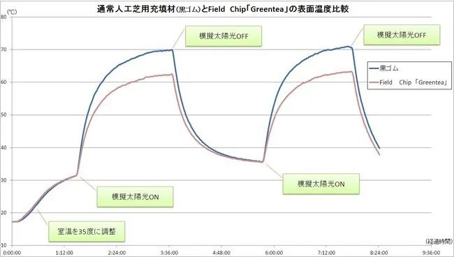 傳統(tǒng)人造草坪橡膠填充材料與茶渣回收材料模擬在太陽(yáng)光下的表面溫度比較。藍(lán)線是橡膠材料,紅線是茶渣回收材料。