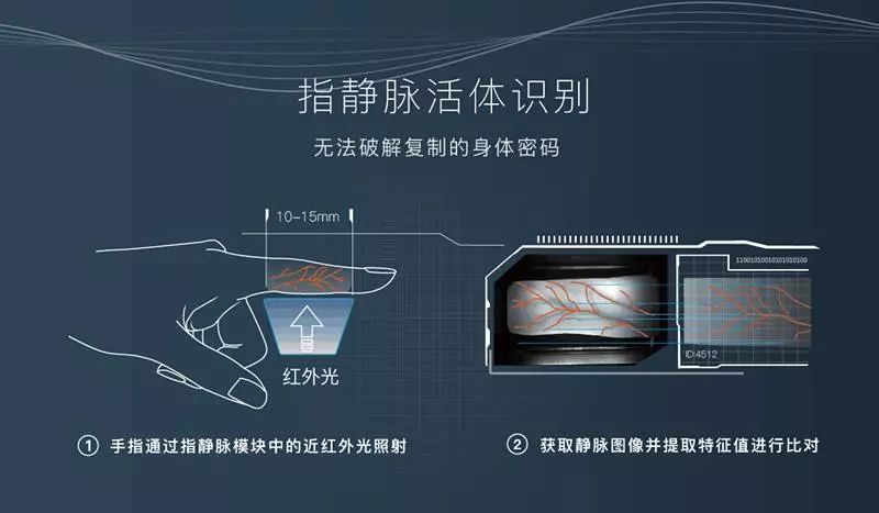 靜脈識(shí)別的基本原理,就是用靜脈血管的結(jié)構(gòu)來(lái)進(jìn)行身份識(shí)別。相比指紋、人臉等顯性生物信息來(lái)說(shuō),指靜脈識(shí)別的靜脈信息深藏于身體內(nèi)部,因此安全性高,無(wú)法被復(fù)制,也不用擔(dān)心被盜用開(kāi)鎖。