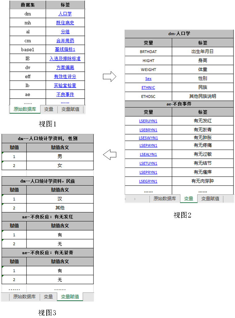 數(shù)據(jù)說明文件用于描述原始數(shù)據(jù)庫和分析數(shù)據(jù)庫的內(nèi)容和結(jié)構(gòu),有助于審閱者快速了解數(shù)據(jù)庫中各數(shù)據(jù)集、變量及其相互間的結(jié)構(gòu)關(guān)系,準確理解遞交的數(shù)據(jù)內(nèi)容。建議采用Excel文件,以表格的形式分別列明原始數(shù)據(jù)庫和分析數(shù)據(jù)庫中所含的數(shù)據(jù)集、變量、變量類型(如字符型、數(shù)值型)、標簽、賦值及其對應(yīng)關(guān)系,具體可參考附錄1《數(shù)據(jù)集、變量關(guān)系列表舉例》。為了便于審閱,數(shù)據(jù)集和變量應(yīng)具有相應(yīng)的中文標簽,標簽長度不宜過長。若使用了外部詞典(如MedDRA),應(yīng)明確使用的外部詞典名稱和版本號。