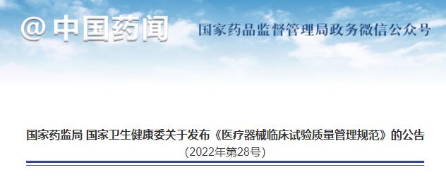 為深化醫(yī)療器械審評審批制度改革,加強醫(yī)療器械臨床試驗管理,根據(jù)《醫(yī)療器械監(jiān)督管理條例》(國務(wù)院令第739號)及《醫(yī)療器械注冊與備案管理辦法》(市場監(jiān)管總局令第47號)、《體外診斷試劑注冊與備案管理辦法》(市場監(jiān)管總局令第48號),國家藥品監(jiān)督管理局會同國家衛(wèi)生健康委員會組織修訂了《醫(yī)療器械臨床試驗質(zhì)量管理規(guī)范》,現(xiàn)予發(fā)布,自2022年5月1日起施行。