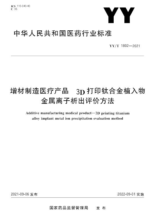 YY/T 1802-2021標準規(guī)定了3D 打印鈦合金植入物金屬離子析出量的體外測試方法。