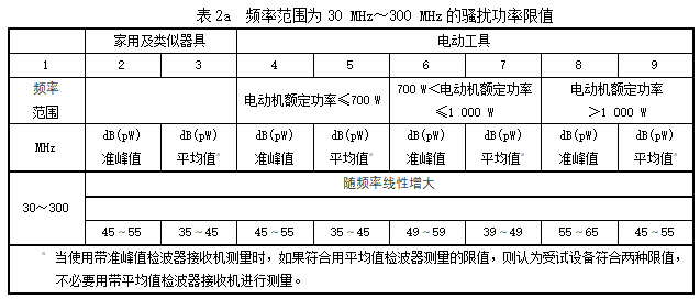 表2a 頻率范圍為30 MHz~300 MHz的騷擾功率限值