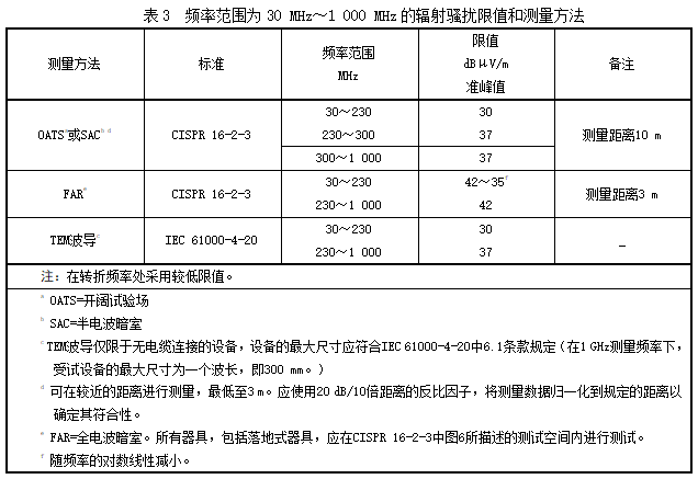 b)符合表3限值。除了TEM波導(dǎo)法僅用于不打算連接外部電纜的電池供電器具,制造商可以選擇表3提及的任一測量方法(見表3腳注c)。