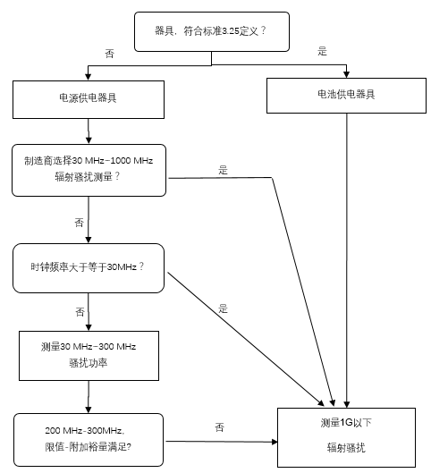 對于電網(wǎng)供電器具,根據(jù)圖10,當制造商選擇騷擾功率法測量并符合表2a限值要求,但不滿足200 MHz~300 MHz頻段限值-附加裕量要求時,應(yīng)進行300 MHz~1000 MHz輻射測量。