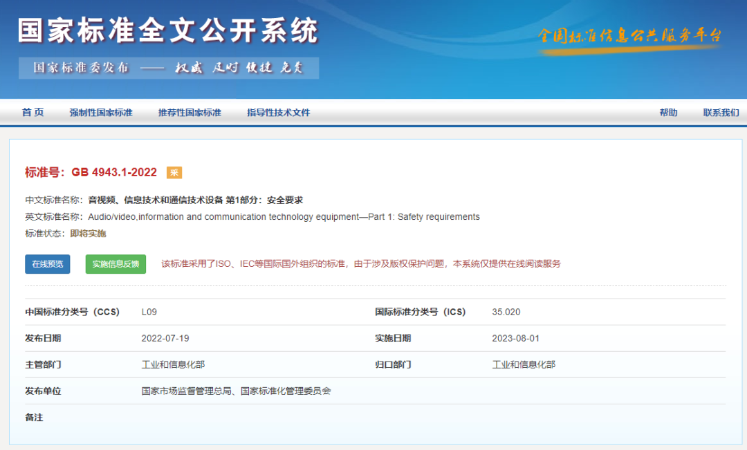 據(jù)國家標(biāo)準(zhǔn)全文公開系統(tǒng)顯示,GB 4943.1-2022《音視頻、信息技術(shù)和通信技術(shù)設(shè)備 第1部分:安全要求》標(biāo)準(zhǔn)全文已公布!標(biāo)準(zhǔn)全文一共346頁。