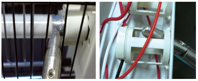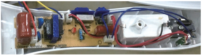 吸入式滅蚊器在該項(xiàng)目上也常出現(xiàn)不合格情況,為電機(jī)供電的電路未與電網(wǎng)電源進(jìn)行充分隔離,拆下集蚊盒,試驗(yàn)探棒可觸及內(nèi)部布線或電機(jī)外殼(如圖5所示)。