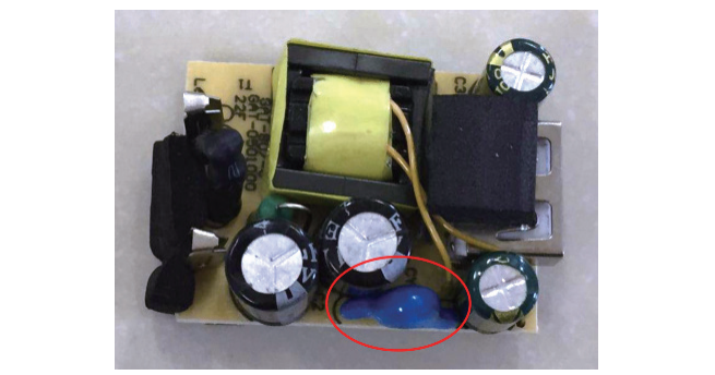 (4)使用適配器(充電器)供電的電滅蚊器具,適配器(充電器)中保護(hù)阻抗僅由一個單獨(dú)元件組成(見圖11)。需要指出,GB 4706.1-2005標(biāo)準(zhǔn)要求保護(hù)阻抗應(yīng)至少由兩個單獨(dú)的元件構(gòu)成,這和GB 4943.1-2011《信息技術(shù)設(shè)備 安全 第1部分:通用要求》[3]和GB 8898-2011《音頻、視頻及類似電子設(shè)備 安全要求》[4]標(biāo)準(zhǔn)均存在差異,企業(yè)在采購適配器(充電器)應(yīng)注意。如果使用了保護(hù)阻抗,則應(yīng)使用兩個元件串聯(lián),或者取消該保護(hù)阻抗。