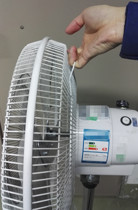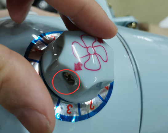 某便攜式電風(fēng)扇,塑料旋鈕上有一顆接地金屬固定螺釘銷釘,人手操作時可以摸到,如圖1和圖2所示。