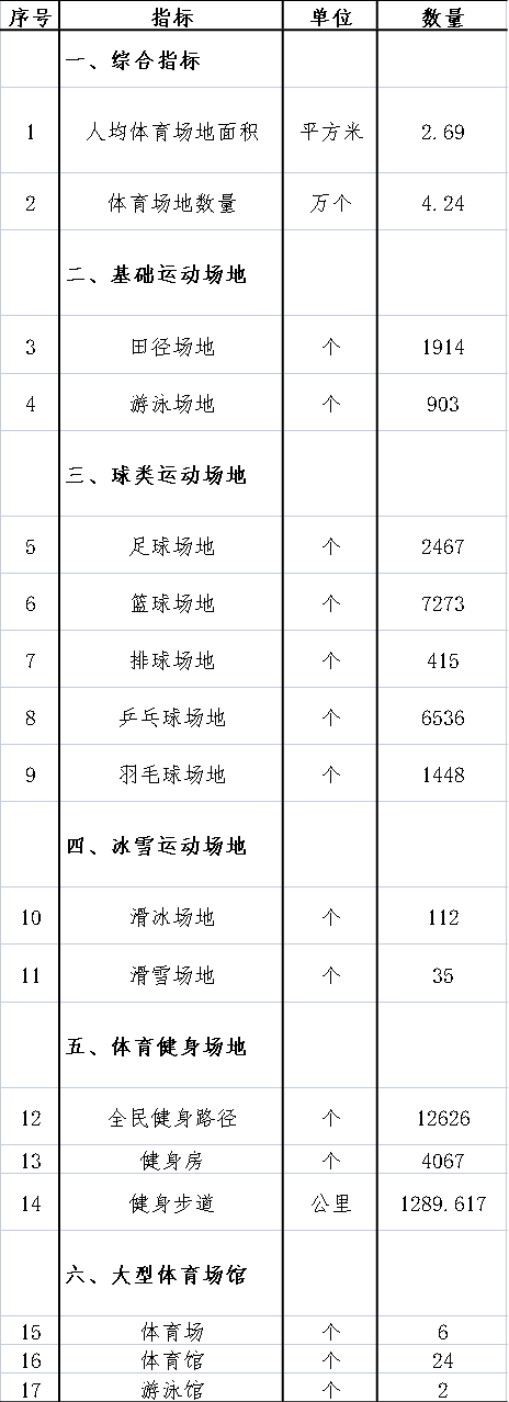 從具體數(shù)據(jù)來看,田徑場地1914個,游泳場地903個;足球場地2467個,籃球場地7273個,排球場地415個,乒乓球場地6536個,羽毛球場地1448個;滑冰場地112個,滑雪場地35個;全民健身路徑12626個,健身房4067個,健身步道1289.617公里;體育場6個,體育館24個,游泳館2個。