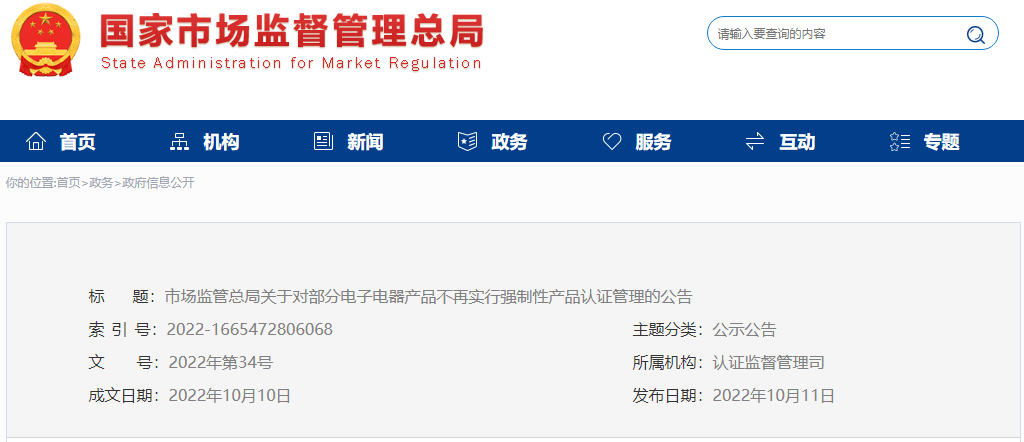 貫徹落實(shí)《國務(wù)院辦公廳關(guān)于深化電子電器行業(yè)管理制度改革的意見》(國辦發(fā)〔2022〕31號)精神,市場監(jiān)管總局按照必要性和最小化原則對強(qiáng)制性產(chǎn)品認(rèn)證(以下稱CCC認(rèn)證)目錄進(jìn)行了調(diào)整?,F(xiàn)將有關(guān)事項(xiàng)公告如下:
