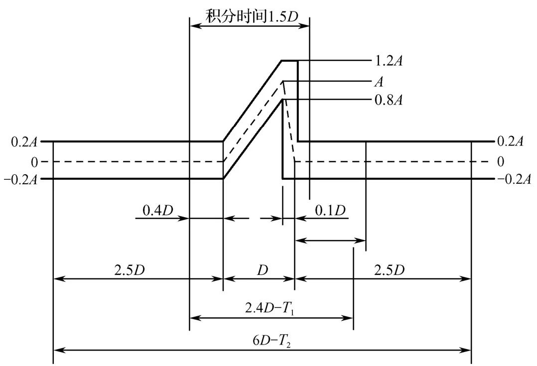 注:--為標稱脈沖線;—為容差范圍線;D—標稱脈沖的持續(xù)時間;A—標稱脈沖的峰值加速度T1—用常規(guī)沖擊機產(chǎn)生沖擊時,對脈沖進行監(jiān)測的最短時間;T2—用電動振動臺產(chǎn)生沖擊時,對脈沖進行監(jiān)測的最短時間