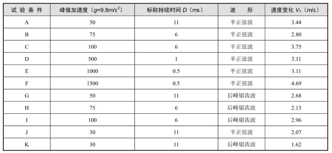 GB/T 2423.5—1995 中給出了脈沖波形和試驗嚴酷等級,試驗時可選用其中的一種脈沖波形和表 1給定的一種嚴酷等級和相應(yīng)的速度變化量。