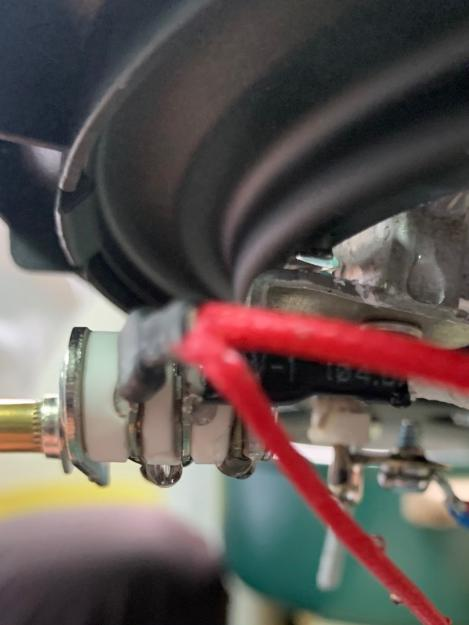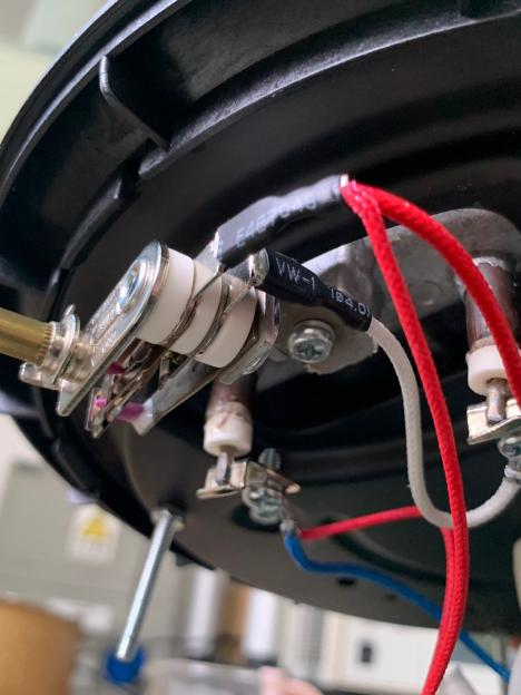 與1min內(nèi)持續(xù)注入器具的試驗(yàn)相比,10 s內(nèi)將等量的水溶液持續(xù)地注入器具,由于流量是前者的6倍,溢出的水就會(huì)從器具邊緣傾瀉而下,如圖4所示,使得更多的水可以進(jìn)入到器具內(nèi)部。在本試驗(yàn)中更直接導(dǎo)致該樣品在經(jīng)受16.3的電氣強(qiáng)度試驗(yàn)時(shí)基本絕緣被擊穿,器具內(nèi)部的可調(diào)式溫控器甚至被濺入的水弄“失效”,如圖5所示,不能滿足第29章功能性絕緣爬電距離的要求。