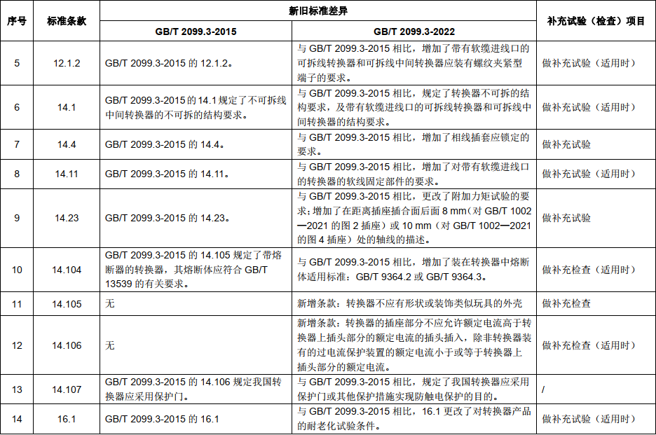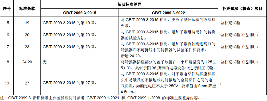 經(jīng)過強制性產(chǎn)品認(rèn)證技術(shù)專家組器具附件組(TC07)對新舊標(biāo)準(zhǔn)的研究分析,表決通過了換版要求。GB/T2099.3一2022標(biāo)準(zhǔn)與GB/T2099.3-2015標(biāo)準(zhǔn)的主要差異及補充試驗(檢查項目)如下。